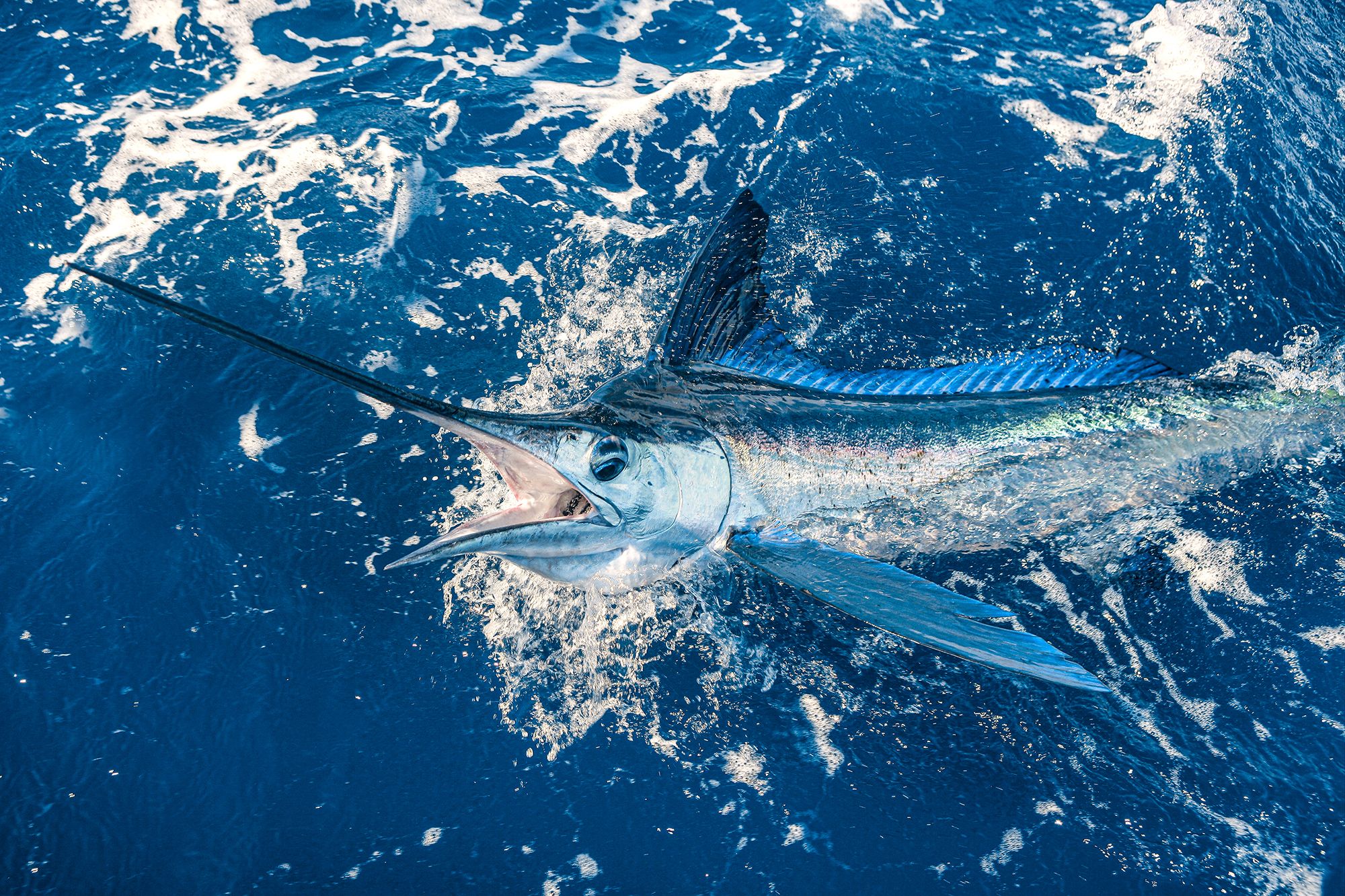 The blue marlin is quite the giant of the seas as it can grow as long as 16 feet and weigh up to 1,800 pounds. The blue marlin (the largest type of marlin) can be caught throughout the year in the Caribbean. Marlins in general are part of the billfish family that also includes swordfish and sailfish. There are several species of marlin that can be found in the Caribbean including white marlin, which are commonly found in shallower inshore waters. The peak season for blue marlin varies among the islands, but in most places, they can be caught year-round as marlin simply love the warm waters of the Caribbean.