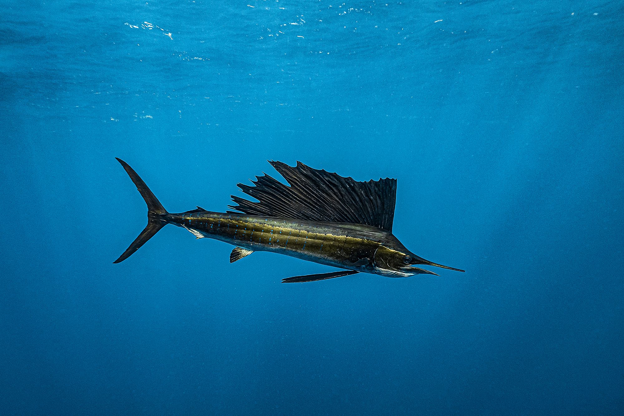 Sailfish are blue and gray and have a large dorsal fin. They are easily identified by their sharp, pointed snout. Sailfish are known as pelagic fish, which means they live in the open sea, not quite at the bottom and not near the shore either.