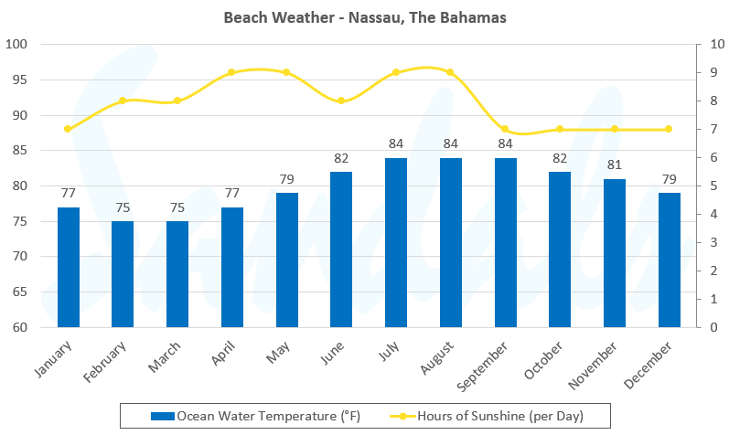In The Bahamas, the sunniest month is April, which sees an average 9.2 daily hours of sunshine. The least sunny month is December, with a recorded 6.9 hours of sunshine per day. You can still expect great beach weather in December; it just gets light a bit later and dark a little earlier.