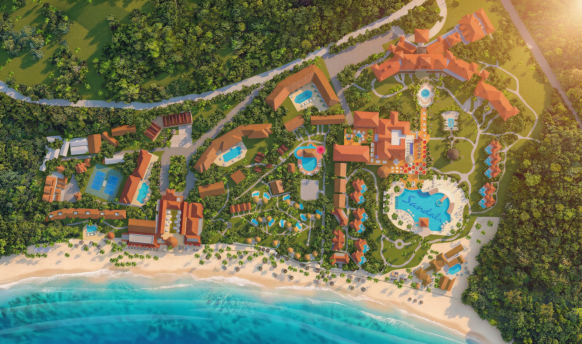 Located on the ground floor of the Cypress and Almond buildings, this cozy suite features a large private patio showcasing serene views of the resort's beautifully landscaped gardens. The suite features a four-poster, king-size bed, flat screen TV, and an en-suite bathroom complete with a double vanity, a whirlpool tub and a separate walk-in rain shower. Guests also enjoy Club Sandals concierge se...